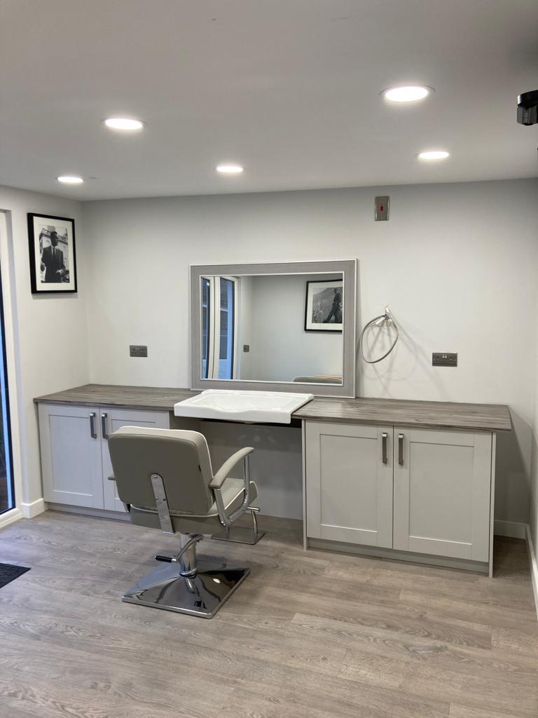 An electric shower was installed for the full salon experience and a blue tooth heater for client comfort and full client control when salon is not in use.